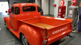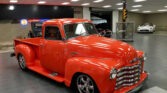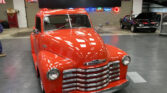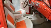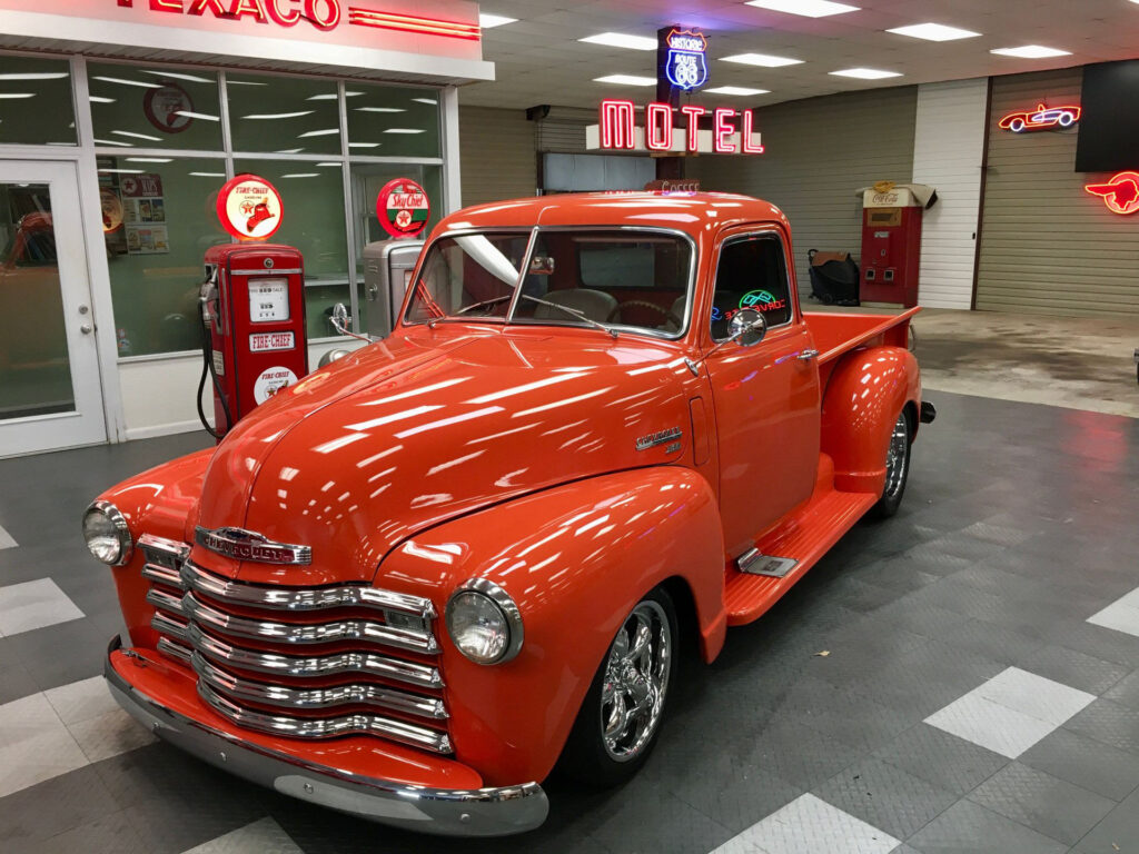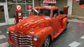 The 1950 Chevrolet 3100 blends vintage design with modern power. Equipped with a 350 V8 and Turbo 350 transmission, it offers a smooth drive. Finished in Hugger Orange with new chrome and stainless, it also has power steering, disc brakes, and A/C.
