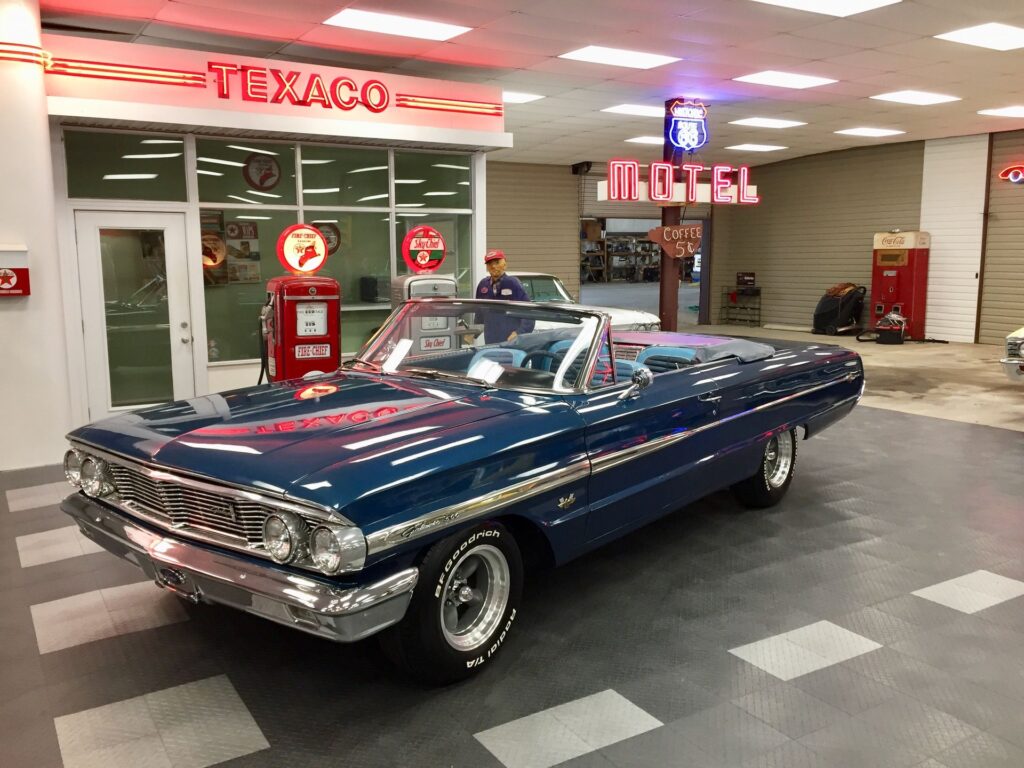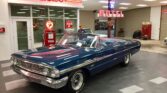 1964 Ford Galaxie 500 XL with a 460 Big Block V8 and C6 transmission. Features power windows, power steering, and 15″ Torque Thrust wheels. Finished in show-quality metallic blue paint with a gray cloth top and beautiful interior. Runs and drives great.
