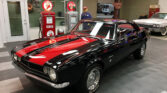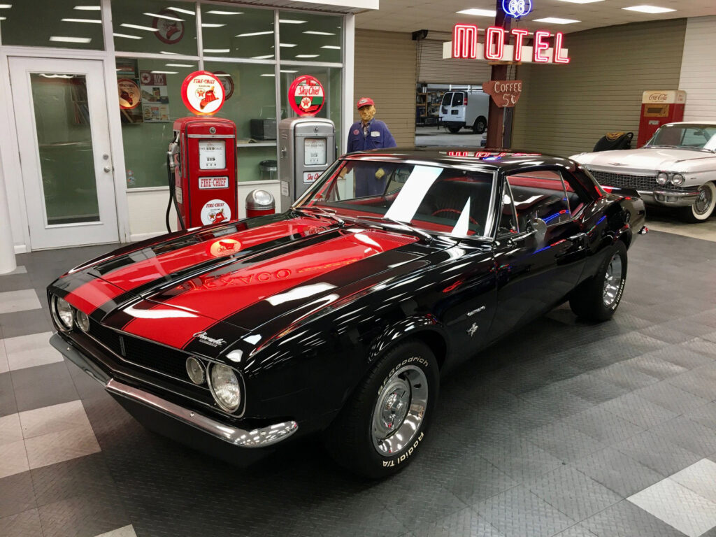 This 1967 Chevrolet Camaro has show-quality black paint and a rebuilt 327 V8 engine with automatic transmission. It features power steering, power disc brakes, and new glass and interior, making it a turn-key classic for both driving and showing.
