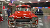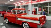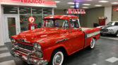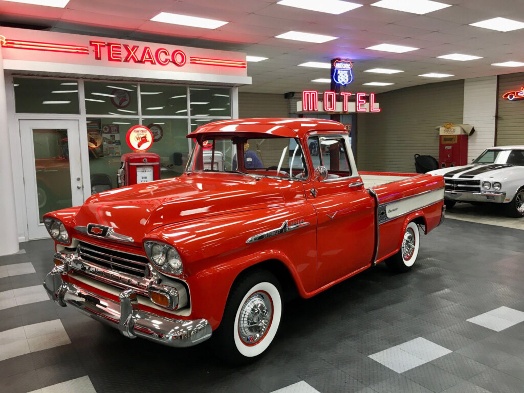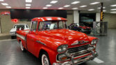 1958 Chevrolet Apache Cameo Restomod with a 350 V8, 700R4 transmission, and GM 10-bolt rear axle. Features power steering, power disc brakes, air conditioning, and 1962 Impala bucket seats. Arrow-straight body, excellent two-tone red and white paint, and turn-key ready for car shows or cruises.